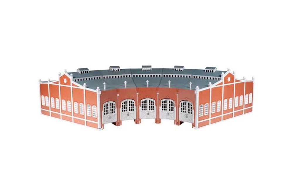 With the Five Bay Roundhouse, you can keep your locomotives on track and under cover while not in use, just like on the real railroad. This snap-fit locomotive facility includes five individual storage bays long enough to hold most steam or diesel locomotives, and five straight sections of Nickel Silver E-Z Track® with separate snap-fit track ends. The roundhouse integrates with the separately available Bachmann #46298 DCC-equipped Turntable and is also readily adaptable for use with HO scale track systems from other manufacturers.