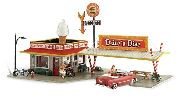 Drive in to this beauty and you?ll be transported back in time! The little diner features a huge ice cream cone on its roof, soda straw supports for the awning, two carhops, bikes, benches, a spilled trashcan and a lamppost. Includes great interior detailing and wiring for the light inside, you just hook it up!