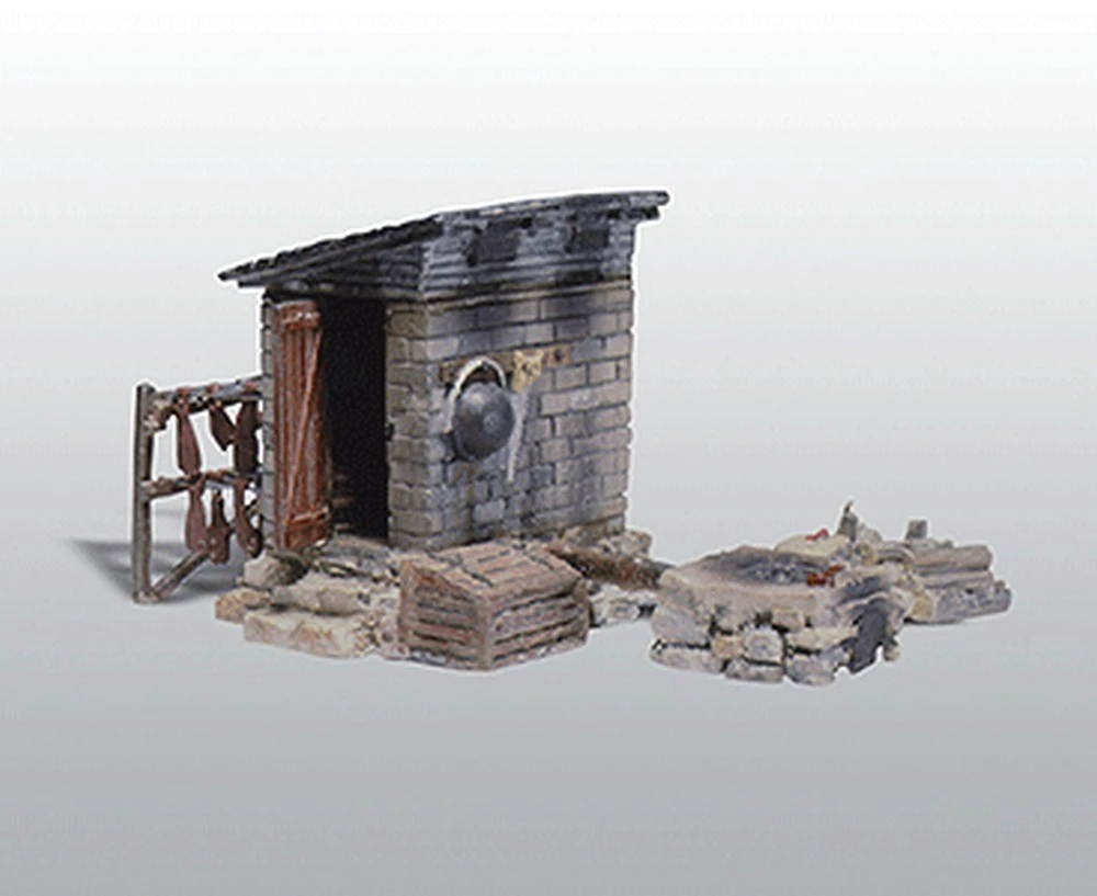 You can add this smokehouse anywhere on your layout. It includes smoked hams hanging on a fence, an old saw and bucket, plus stone and lumber piles. The highly detailed, unpainted kit is cast in lead-free metal and is easy to assemble.